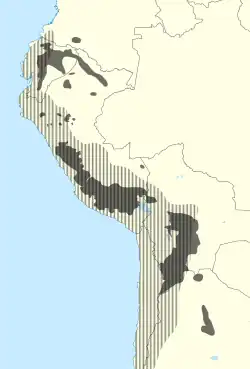 ![]() Distribuição das línguas quíchuas atuais (em cinza) e do Império Inca (hachurado) | |