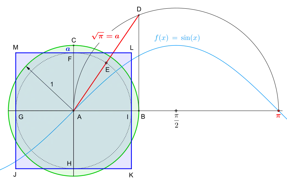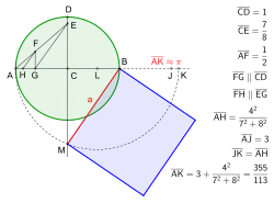 Isto significa que, no círculo unitário, duas casas decimais do comprimento do lado do quadrado são iguais àquelas de .