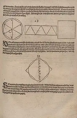 A construção seguinte encontra-se por um lado nos Babilónios e, por outro lado, é insinuada nas publicações do agrimensor romano Vitrúvio.[22] Ela fornece o valor 3+1⁄8 para . Para indicar um método gráfico conveniente, Albrecht Dürer retoma esta construção em 1525 na sua obra Underweysung der Messung mit dem Zirckel und Richtscheyt (Instrução de Medição com o Compasso e a Régua). Dürer tem consciência de que esta é uma mera solução aproximada e escreve explicitamente que uma solução exata ainda não tinha sido encontrada: