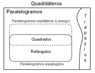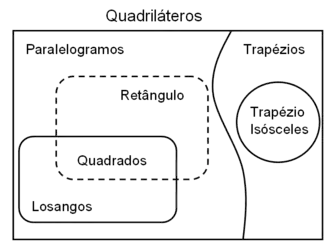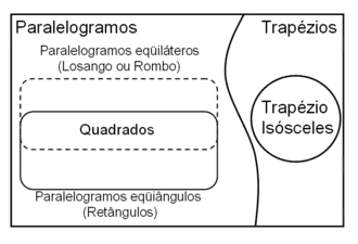 Note que todos estes matemáticos consideram o conjunto dos quadriláteros como uma bipartição por disjunção, ou seja, não existem paralelogramos que são trapézios e vice – versa. Isto não anula a existência de estudos e literaturas que discutam a possibilidade de o conjunto dos paralelogramos ser um subconjunto do conjunto dos trapézios. É o caso dos estudos dos matemáticos: Guy Laville;[7] Fritz Reinhardt et Heinrich Soeder em seu Atlas des Mathématiques;[8] Vicenzo Bongiovanni na Revista do Professor de Matemática, Nª 72[9] e José Adelino Serrasqueiro no seu Tratado de Geometria Elementar.[10]