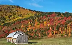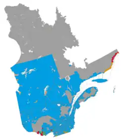 O ponto mais alto do Quebec, a 1652 metros de altitude, é o Mont d'Iberville, localizado na fronteira com Terra Nova e Labrador, na parte nordeste da província.[73] A região fisiográfica mais populosa é a Basses-terres du Saint-Laurent, que se estende para nordeste a partir da porção sudoeste da província ao longo das margens do rio São Lourenço até a região da Cidade de Quebec, limitada ao norte pelos Montes Laurentides e ao sul pelos Apalaches. Abrange principalmente as áreas de Centre-du-Québec, Laval, Montérégie e Montreal, e as regiões do sul de Capitale-Nationale, Lanaudière, Laurentides e Mauricie, inclui a ilha Anticosti e outras pequenas ilhas,[74] além da ecorregião das florestas baixas do Golfo de São Lourenço.[75] Sua paisagem é baixa e plana, exceto por afloramentos ígneos isolados perto de Montreal, antigamente cobertos pelas águas do Lago Champlain. As colinas de Oka também se erguem da planície. Geologicamente, as terras baixas formavam um vale há cerca de 100 milhões de anos e são propensas a terremotos frequentes e significativos.[69] As camadas mais recentes de rochas sedimentares foram formadas no leito marinho do antigo mar no final da última era glacial, cerca de 14 000 anos atrás.[76] A combinação de solos ricos e facilmente aráveis e o clima relativamente quente dessa parte do Quebec faz deste vale a área agrícola mais prolífica da província. As florestas fornecem a maior parte da safra de xarope de bordo da primavera no Canadá. A parte rural da paisagem é dividida em trechos de terra retangulares estreitos que se estendem do rio e remontam do século XVII.