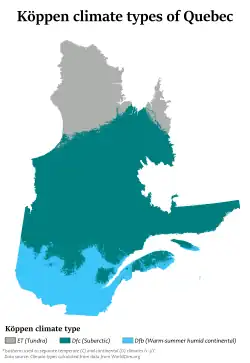O clima ao redor das grandes cidades é continental, com invernos frios e nevosos e com verões quentes e geralmente úmidos, mas as temporadas de inverno mais longas dominam e como resultado as áreas setentrionais da província são marcadas por condições de tundra.[11] Mesmo no centro do Quebec, em latitudes comparativamente mais ao sul, os invernos são severos em áreas do interior.