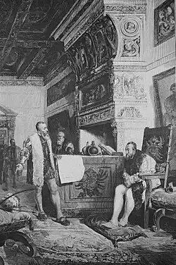 Gravura que representa o conquistador espanhol Francisco Pizarro expondo ao rei Carlos I de Espanha os indícios da descoberta do Império dos Incas.