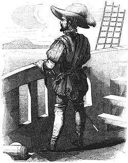 Gravura que representa Pedro de Candía atirando com um arcabuz, com o objetivo de mostrar e surpreender os índios de Tumbes