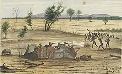 A guerra, às vezes chamada de "guerra do extermínio",[26] eclodiu entre aborígines e colonos na Queensland colonial. A guerra fronteiriça foi notável por ser a mais sangrenta da Austrália, talvez devido à grande população indígena de Queensland quando comparada às outras colônias australianas. Cerca de 1 500 colonos europeus e seus aliados (compostos de assistentes chineses, aborígines e melanésios) foram mortos em conflitos de fronteira durante o século XIX. As baixas entre o povo aborígine podem ter excedido 30 000 mortos. A "Força Policial Nativa", empregada pelo governo de Queensland, foi fundamental para ajudar na opressão dos povos indígenas.[27] Em 27 de outubro de 1857, os aborígenes que revidaram o fato de serem envenenados e estuprados por membros de família de colonos atacaram a estação pastoral do Hornet Bank no rio Dawson, matando onze pessoas. Este foi um dos maiores massacres de colonos britânicos por indígenas australianos.[28][29][30][31] O maior massacre relatado de colonos por aborígenes foi em 1861, no rio Nogoa, onde 19 pessoas foram mortas.[32] Um autor estima que 24.000 homens, mulheres e crianças aborígines morreram nas mãos da Polícia Nativa na Queensland colonial entre 1859 e 1897.[33]