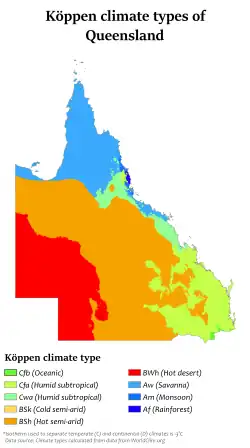 Existem seis zonas climáticas predominantes em Queensland,[49] com base na temperatura e umidade: