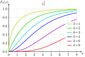 Função de distribuição cumulativa ![]() A função distribuição acumulada da distribuição χ² | |