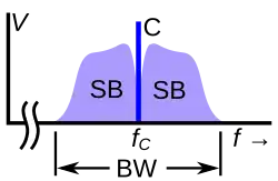 Uma onda de rádio modulada, transportando um sinal de informação, ocupa uma faixa de frequências. A informação (modulação) em um sinal de rádio geralmente está concentrada em bandas de frequência estreitas chamadas bandas laterais (SB) logo acima e abaixo da frequência portadora . A largura em hertz da faixa de frequência que o sinal de rádio ocupa, a frequência mais alta menos a frequência mais baixa, é chamada de largura de banda (BW).[30][35] Para qualquer relação sinal-ruído, uma quantidade de largura de banda pode transportar a mesma quantidade de informação (taxa de dados em bits por segundo), independentemente de onde ela esteja localizada no espectro de radiofrequência, portanto, a largura de banda é uma medida da capacidade de transporte de informações. capacidade. A largura de banda exigida por uma transmissão de rádio depende da taxa de dados da informação (sinal de modulação) enviada e da eficiência espectral do método de modulação utilizado; quantos dados ele pode transmitir em cada quilohertz de largura de banda. Diferentes tipos de sinais de informação transmitidos por rádio têm diferentes taxas de dados. Por exemplo, um sinal de televisão (vídeo) tem uma taxa de dados maior que um sinal de áudio.[30][36]