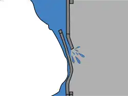 O impacto do iceberg havia entortado as placas de aço do casco e causado seis pequenas aberturas, com todas juntas equivalendo a uma área de pouco mais de um metro quadrado de todo o navio. A maior abertura tinha por volta de doze metros de comprimento e aparentemente seguiu a linhas das placas de aço.[112] As placas na parte central do navio eram mantidas unidas por três fileiras de rebites feitos de aço de carbono, porém as placas da proa e popa ficavam presas por duas linhas de rebites feitos com ferro forjado, que segundo especialistas estavam no limite da tensão antes mesmo da colisão.[113] Esse segundo tipo de rebite era mais propenso a sair do lugar em situações de grande tensão, ainda mais sob um frio extremo como na noite em que o Titanic afundou.[114]