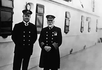 O comandante do navio era o capitão Edward Smith, o mais respeitado oficial da White Star Line e extremamente popular entre os passageiros da primeira classe, tendo comandado todos os maiores e mais novos navios da companhia desde 1904.[66] Henry Wilde de última hora chegou para ser o oficial chefe e o segundo no comando do Titanic, causando uma mudança na hierarquia dos oficiais.[67] Isso fez com que os três oficiais mais graduados da embarcação fossem os mesmos que haviam trabalhado no Olympic (com o terceiro sendo o primeiro oficial William Murdoch). Além deles, também estavam a bordo o segundo oficial Charles Lightoller, terceiro oficial Herbert Pitman, quarto oficial Joseph Boxhall, quinto oficial Harold Lowe e sexto oficial James Moody.[68] Eles eram os encarregados de comandar a tripulação do convés e garantir o andamento e bom funcionamento de toda a embarcação. Eles eram auxiliados por quartel-mestres que cuidavam da roda do leme, os vigias que trabalhavam no cesto de gávea e os marinheiros que ficavam na manutenção dos diversos dispositivos a bordo.[69][70]