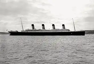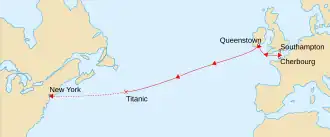 O Titanic então rumou para Queenstown na Irlanda, chegando às 11h30min do dia seguinte. Sete passageiros desceram e 120 embarcaram,[89] principalmente imigrantes da terceira classe que pretendiam tentar a vida nos Estados Unidos. O navio deixou Queenstown às 13h30min e iniciou sua travessia transatlântica para Nova Iorque com 1 316 passageiros e 889 tripulantes.[90] Desde o naufrágio muitas vezes se afirmou que o capitão Smith planejava se aposentar ao final da viagem;[91] entretanto, não existem evidências concretas que essa era realmente sua intenção[92] enquanto outras fontes sugerem que a White Star Line planejava mantê-lo no comando do Titanic até o lançamento do Britannic, então agendado para 1914.[93]