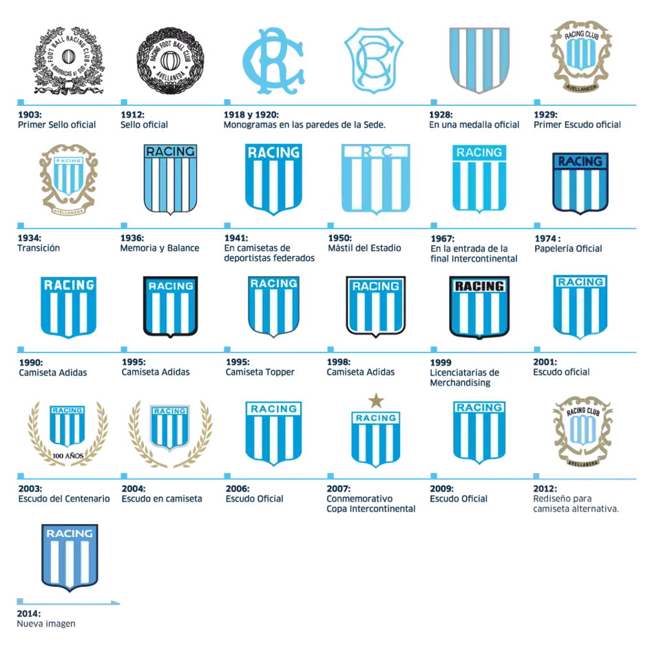 Todos os escudos históricos do Racing Club de 1903 a 2014 com o escudo atualmente utilizado pela instituição Albiceleste.