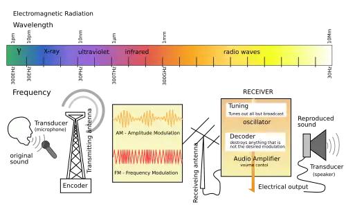 O método mais usado na radiodifusão ainda é a Amplitude modulada (AM, ver: Rádio AM), que é a variação da amplitude da portadora dependente do áudio inserido no modulador (Misturador).