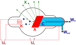 • O cátodo (negativo) consiste em um filamento aquecido de tungstênio que proporciona a fonte de elétrons.
