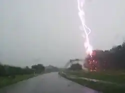 Frequentemente raios caem sobre o solo, portanto, obras de infraestrutura desprotegidas estão sujeitas aos danos advindos das descargas elétricas. A extensão dos danos causados depende grandemente das características do próprio local da descarga, especialmente sua condutividade elétrica, além da intensidade da corrente e da duração do raio. Ondas acústicas costumam ocasionar danos relativamente pequenos, como a quebra de vidraças.[77] Ao atingir um objeto, a corrente elétrica aumentará enormemente sua temperatura, de forma que materiais combustíveis oferecem riscos.[78] Linhas de transmissão de energia são elementos vulneráveis, existindo inúmeros casos de apagões, dentre os mais notáveis o apagão em Nova Iorque de 1977 e os apagões de 1999 e de 2009 no Brasil e Paraguai.[79][80]