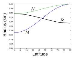 Três raios diferentes em função da latitude da Terra. R é o raio geocêntrico; M é o raio de curvatura meridional; e N é o raio de curvatura vertical principal