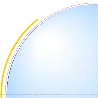 Um diagrama em escala do achatamento polar do elipsóide de referência do IERS de 2003, com o norte no topo. A região azul claro é um círculo. A borda externa da linha azul escura é uma elipse com o mesmo semieixo menor do círculo e a mesma excentricidade da Terra. A linha vermelha representa a linha de Kármán 100 km acima do nível do mar, enquanto a área amarela denota a faixa de altitude da ISS em órbita baixa da Terra