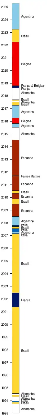 | 13 (1994, 1995, 1996, 1997, 1998, 1999, 2000, 2002, 2003, 2004, 2005, 2006 e 2022) | 5 (2007, 2009, 2016, 2017 e 2021) | 5 (1993, 2001, 2018, 2019 e 2020) | |