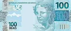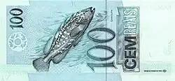 100 reais | Frente: Efígie da República, interpretada como uma escultura. Verso: Garoupa Dimensões: 140 x 65 mm. |
