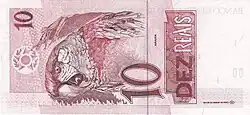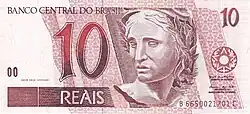 10 reais | Frente: Efígie da República, interpretada como uma escultura. Verso: Arara Dimensões: 135 x 65 mm. |