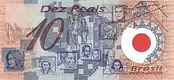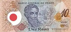 10 reais | 2000 | Polímero (plástico) | Frente: Efígie de Pedro Álvares Cabral, descobridor do Brasil. Reverso: Versão estilizada do mapa do Brasil, com quadros ressaltando a pluralidade étnica e cultural do país. |