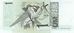 1 real | Frente: Efígie da República, interpretada como uma escultura. Verso: Beija-flor. Dimensões: 140 x 65 mm. |