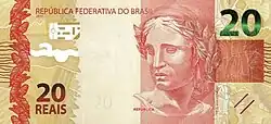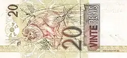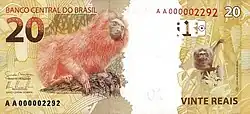 20 reais | Frente: Efígie da República, interpretada como uma escultura. Verso: Mico-leão-dourado Dimensões: 140 x 65 mm. |