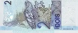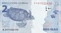 2 reais | Frente: Efígie da República, interpretada como uma escultura. Verso: Tartaruga-de-pente. Dimensões: 140 x 65 mm. |