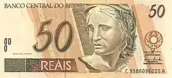 50 reais | Frente: Efígie da República, interpretada como uma escultura. Verso: Onça-pintada Dimensões: 149 x 70 mm. |