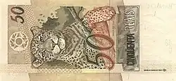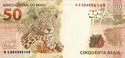 50 reais | Frente: Efígie da República, interpretada como uma escultura. Verso: Onça-pintada Dimensões: 140 x 65 mm. |