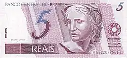 5 reais | Frente: Efígie da República, interpretada como uma escultura. Verso: Garça Dimensões: 140 x 65 mm. |