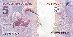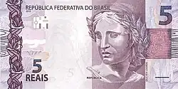 5 reais | Frente: Efígie da República, interpretada como uma escultura. Verso: Garça Dimensões: 128 x 65 mm. |