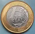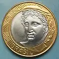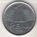 1 real | Metal: Aço inoxidável[35] (borda lisa). Anverso: À direita, a efígie representativa da República, ladeada por representação estilizada de ramo de louros. Na parte inferior, a inscrição "BRASIL". Reverso: Inscrição indicativa de valor, ladeada por ramos de louros. Abaixo, os dísticos "real" e o correspondente ao ano de cunhagem. Obs.: Essa moeda saiu de circulação em 23 de dezembro de 2003.[38] |