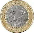 1 centavo | Metal: Aço revestido com cobre (borda lisa).[39] Reverso: Pedro Álvares Cabral, navegador português responsável pelo descobrimento do Brasil, e caravela portuguesa. Obs.: A moeda de um centavo deixou de ser fabricada pela Casa da Moeda do Brasil em dezembro de 2004.[36][37] |