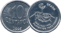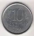 10 centavos | Metal: Aço inoxidável[35] (borda lisa). Anverso: À direita, a efígie representativa da República, ladeada por representação estilizada de ramo de louros. Na parte inferior, a inscrição "BRASIL". Reverso: Inscrição indicativa de valor, ladeada por ramos de louros. Abaixo, os dísticos "centavos" e o correspondente ao ano de cunhagem. Obs.: Há uma edição comemorativa do 50 anos da FAO para esta moeda | |