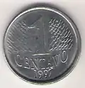 1 centavo | Metal: Aço inoxidável[35] (borda lisa). Anverso: À direita, a efígie representativa da República, ladeada por representação estilizada de ramo de louros. Na parte inferior, a inscrição "BRASIL". Reverso: Inscrição indicativa de valor, ladeada por ramos de louros. Abaixo, os dísticos "centavo" e o correspondente ao ano de cunhagem. Obs.: A moeda de um centavo deixou de ser fabricada pela Casa da Moeda do Brasil em dezembro de 2004][36][37] |