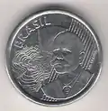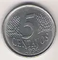 5 centavos | Metal: Aço inoxidável[35] (borda lisa). Anverso: À direita, a efígie representativa da República, ladeada por representação estilizada de ramo de louros. Na parte inferior, a inscrição "BRASIL". Reverso: Inscrição indicativa de valor, ladeada por ramos de louros. Abaixo, os dísticos "centavos" e o correspondente ao ano de cunhagem. | |