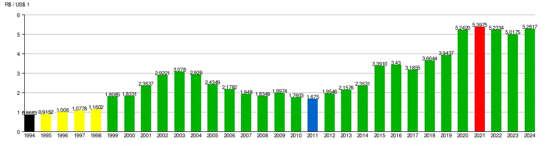 Em janeiro de 1999, entretanto, a crise financeira decorrida da crise financeira asiática em 1997, da quebra da Rússia em 1998, e da crise financeira argentina, levou o Banco Central do Brasil a abandonar o modelo de câmbio semifixo e a deixar o câmbio flutuar livremente. A súbita desvalorização do real no início de 1999, de 1,2: 1 para quase 2,0: 1 marcou o fim da absoluta previsibilidade do câmbio.[15] Entre 1999 e 2003 o câmbio evoluiu de maneira irregular mas geralmente no sentido de desvalorização, atingindo a cotação mínima de 3,9 R$: 1 USD no final de 2002. Em seguida a tendência geral se inverteu, e em 2006 o câmbio havia retornado ao patamar de 2,2: 1. Desde essa época o câmbio flutuou ao redor de 2 reais para 1 dólar até meados de 2015.[14][16] Em 28 de julho de 2023, a divisa atingia o valor de R$ 5,72, utilizando-se da cotação PTAX.[17]