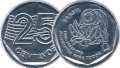 25 centavos | Metal: Aço inoxidável[35] (borda lisa). Anverso: No centro, a efígie representativa da República, ladeada pela inscrição "BRASIL". Na parte inferior, dístico correspondente ao ano de cunhagem. Reverso: Linhas sinuosas de fundo dão destaque ao dístico correspondente ao valor facial, seguido do dístico "centavos". Obs.: Há uma edição comemorativa do 50 anos da FAO para esta moeda. |