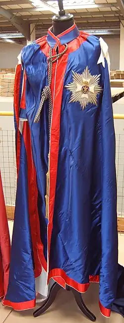 Em eventos formais, ou dias de colarinho , dos quais existem 34 ao longo do ano, como o dia de ano novo e os aniversários reais, Grand Cross de Knights and Dames Grand usa o colar de libré da ordem vitoriana real , consistindo de uma corda alternada de ouro octogonal peças representando uma rosa de ouro em um campo azul e molduras oblongas de ouro, dentro das quais há uma das quatro inscrições: Victoria , Britt. Reg. (Rainha dos Britain), Def. Fid. ( fidei defensor ou defensor da fé) e Ind. Imp. ( Imperatriz da Índia) A corrente suporta um medalhão octogonal maior com uma superfície de esmalte azul com bordas em vermelho e carregada com um saltire , sobre o qual é uma efígie da rainha Victoria; os membros da ordem suspendem deste medalhão suas insígnias como um emblema pendente . Embora após a morte de um cavaleiro ou da Grande Cruz dama suas insígnias possam ser mantidas por sua família, o colar deve ser devolvido. A Grand Cross de Knights and Dames também usa um manto de cetim azul escuro com bordas de cetim vermelho e forrado de cetim branco, exibindo uma representação da estrela da ordem no lado esquerdo.