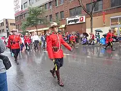 As botas negras foram alterados para o marrom estilo moderno. As cintas (com o apoio pelo ombro direito) foram alterados posteriormente pelo marrom usado atualmente. A cor marrom das botas usado com a farda vermelha é oriundo vem através da aplicação de numerosos polimentos, muitas vezes durante a sua confecção no depósito de vestimentas da RCMP.