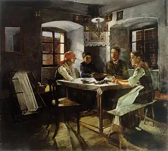 O realismo socialista é a linguagem estética adotada oficialmente desde os anos trinta pelos governos da antiga União Soviética e de outros países comunistas.[54] Por ocasião do Primeiro Congresso de Todos os Sindicatos dos Escritores Soviéticos, realizado em Moscou em 1934, declarou-se que o realismo socialista deveria ser o estilo artístico oficial da União Soviética.[55] Congressos semelhantes designados às outras artes seguiram-se a ele, proclamando que o realismo socialista era também o único tipo de arte aceitável. A produção de uma arte de propaganda ligada à ideologia revolucionária e facilmente apreensível pelas massas foi encorajada pelo Comité Central do partido bolchevique desde os primeiros anos após a Revolução de Outubro.[54] A partir de 1917, o governo comunista estava exercendo cada vez mais a centralização e controle da produção cultural, procedendo então à nacionalização dos museus e das coleções de arte privadas. A partir de 1934, todos os artistas tiveram de fazer parte do Sindicato dos Artistas Soviéticos controlado pelo Estado e de criar obras segundo o modelo aceito. O realismo socialista,[55] fundado sobre regras gramaticais rígidas e limitadas, abrangia um espectro temático que incluía cenas populares, paisagens rurais e urbanas, a representação de atividades cotidianas do proletariado ou do Exército Vermelho e o retrato (geralmente dos grandes dirigentes e dos heróis da revolução).[54]