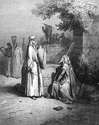 Rebeca foi descoberta por Eliezer, servo de Abraão, que se comprometeu a encontrar uma esposa para Isaque, entre os parentes do patriarca hebreu. Ao se aproximar da cidade onde viviam os familiares de Abraão, Eliezer parou próximo a um poço e orou a Deus pedindo um sinal que permitisse a ele identificar a jovem escolhida para se casar com Isaque. O servo de Abraão pediu que aparecesse uma donzela de grande formosura que daria de beber água a ele e aos seus camelos antes de a si própria (Gênesis 24:43–46), coisa que não é normal até os dias de hoje. O dote de Rebeca foi o de maior proporção e riquezas da época. Foram oferecidos dez camelos (Gênesis 24:10) e vários utensílios de ouro. Após ter saciada sua sede e a de seus camelos, Eliezer imediatamente deu a Rebeca um pendente e duas pulseiras de ouro (Gênesis 24:47), e o resto do tesouro foi para o seu pai Betuel.