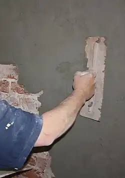Reboco sendo aplicado com uma desempenadeira sobre uma parede de alvenaria.