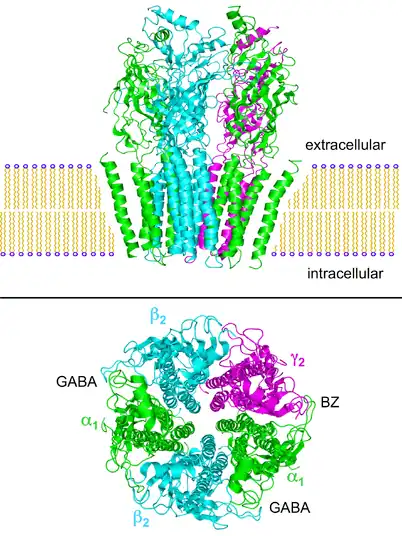 Estrutura do receptor nicotínico de acetilcolina (nAchR: PDB 2BG9) o qual é muito similar ao receptor GABAA .[1][2][3] Topo: vista lateral da Nachr incorporada em uma membrana celular. Abaixo: vista do receptor extracelular a partir da face da membrana. As subunidades são rotulados de acordo com a nomenclatura GABAA e as localizações aproximadas do GABA e benzodiazepinas (BZ) os sítios de ligação são anotadas (entre o α-e β-subunidades e entre os α-e γ-subunidades, respectivamente).