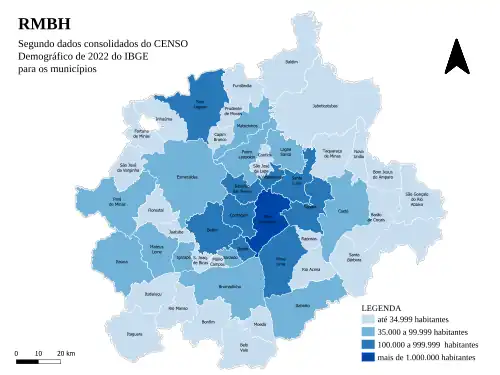 A população da Região Metropolitana de Belo Horizonte no Censo Demográfico de 2022 somou o total de 5.733.783 habitantes, sendo 5.128.282 moradores nos 34 municípios metropolitanos e outros 605.501 nos 16 do colar metropolitano, figurando como a terceira maior aglomeração urbana do Brasil,[12] e a 60º maior do mundo.[15] Os municípios mais populosos da RMBH são, em ordem decrescente, Belo Horizonte, Contagem, Betim e Ribeirão das Neves, que juntas reúnem aproximadamente dois terços da população da região metropolitana.[12]