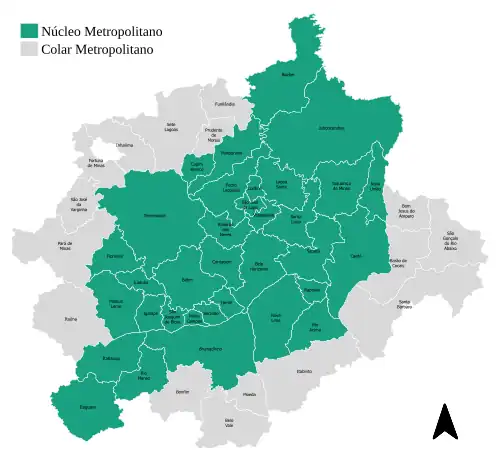 A Região Metropolitana de Belo Horizonte, propriamente, é constituída por 34 municípios, a saber:[11] Baldim, Belo Horizonte, Betim, Brumadinho, Caeté, Capim Branco, Confins, Contagem, Esmeraldas, Florestal, Ibirité, Igarapé, Itaguara, Itatiaiuçu, Jaboticatubas, Juatuba, Lagoa Santa, Mário Campos, Mateus Leme, Matozinhos, Nova Lima, Nova União, Pedro Leopoldo, Raposos, Ribeirão das Neves, Rio Acima, Rio Manso, Sabará, Santa Luzia, São Joaquim de Bicas, São José da Lapa, Sarzedo, Taquaraçu de Minas e Vespasiano.