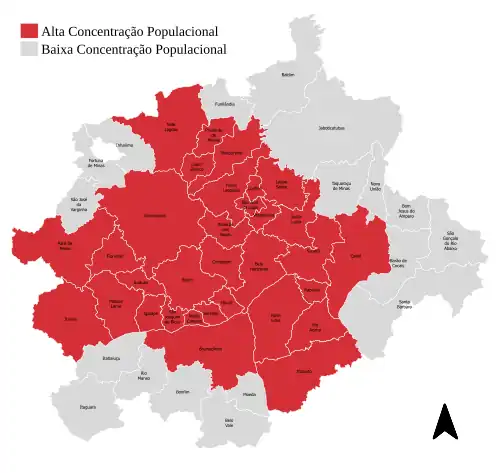 Embora seja a terceira região metropolitana mais populosa do Brasil, sua sede, o município de Belo Horizonte, ocupa a sexta posição entre os municípios mais populosos do país. Só nos anos 2000, a população do município foi superada pelo Distrito Federal e Fortaleza. Esse fenômeno ocorre porque o município de Belo Horizonte, com área de 331 km2, é relativamente pequeno se comparado aos dois municípios mais populosos do Brasil, São Paulo (1 521 km2) e Rio de Janeiro (1 197 km2).[5]