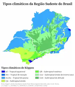 O clima subtropical, que ocorre no sul de São Paulo, é caracterizado por chuvas bem divididas no decorrer do ano (temperaturas médias anuais por volta de 16 °C e 17 °C) e por uma enorme amplitude térmica anual. Temos também, no norte de Minas Gerais, o clima semiárido mais cálido e menos chuvoso, abrigando estação seca anual entre quatro e cinco meses ou até mais nos vales dos rios São Francisco e Jequitinhonha.[17]