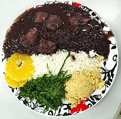 Típica feijoada à brasileira, acompanhada de arroz, couve, farofa e laranja.